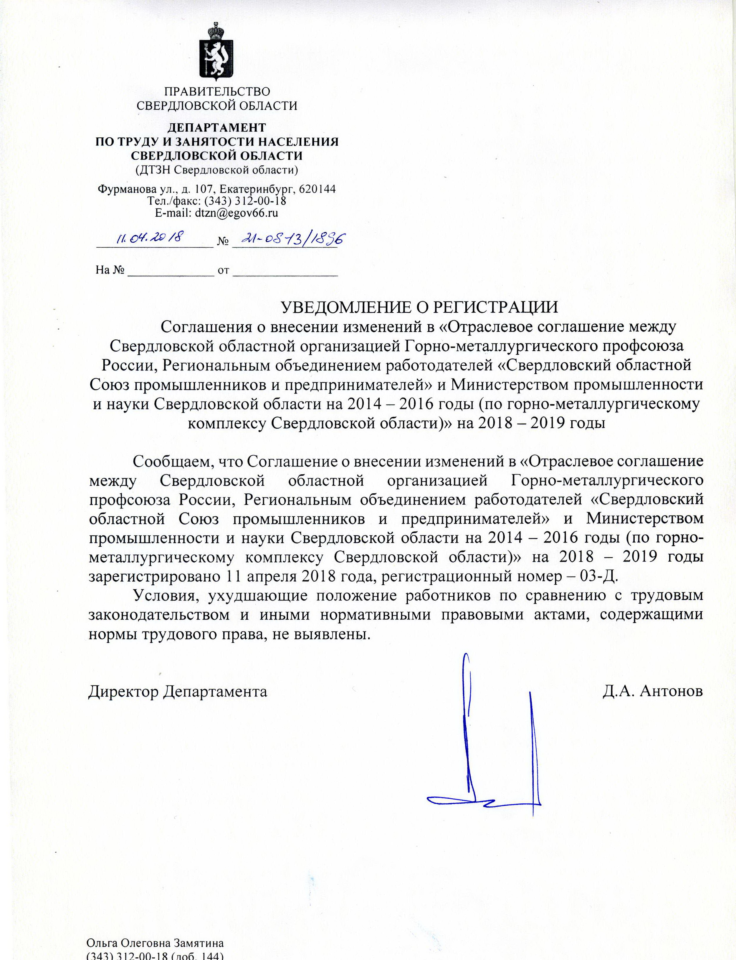 о внесении изменений в «Отраслевое соглашение между Свердловской областной организацией Горно-металлургического профсоюза России, Региональным объединением работодателей «Свердловский областной Союз промышленников и предпринимателей» и Министерством промышленности и науки Свердловской области на 2014 - 2016 годы (по горно-металлургическому комплексу Свердловской области)» на 2018 - 2019 годы